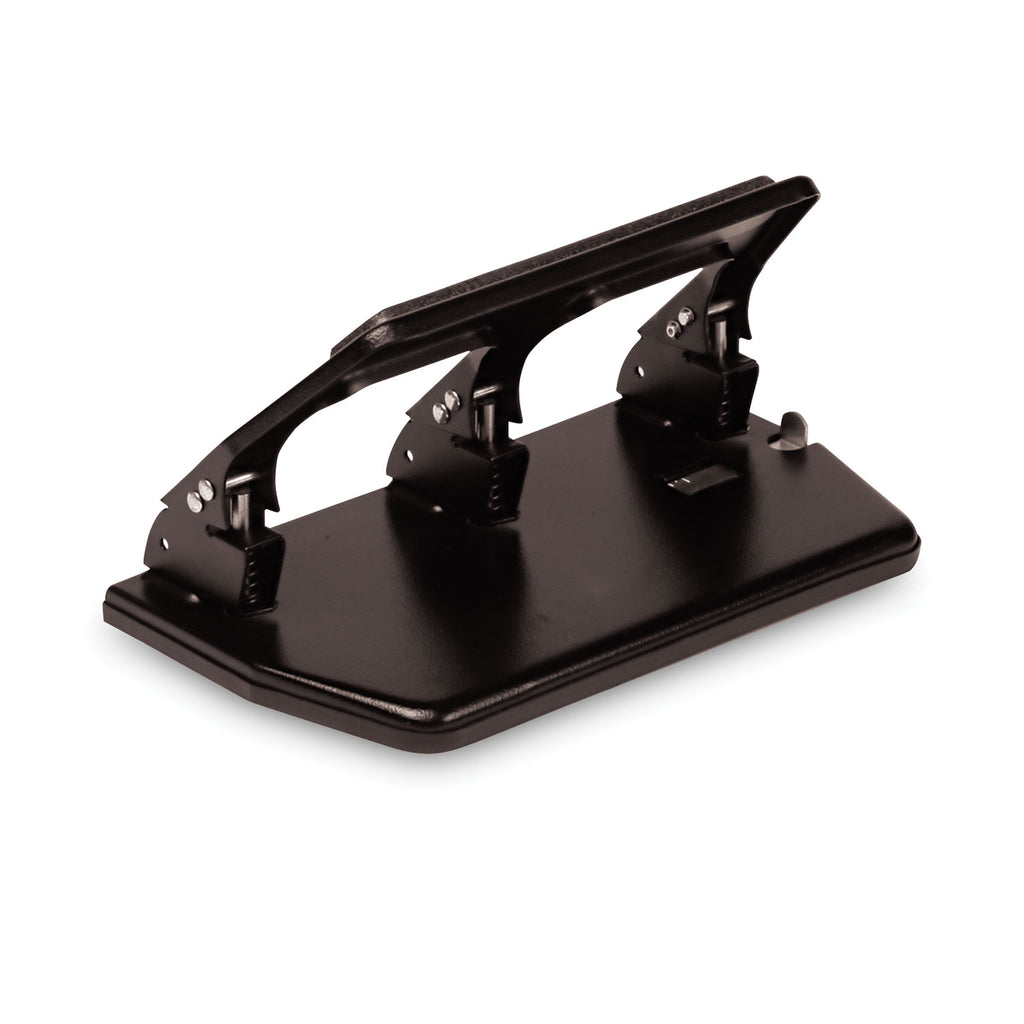 Add comfort to punching tasks with soft-touch gel padded handle. Adjustable ruled paper centering guide ensures accurate punching. Pre-set to punch holes to fit a standard three-ring binder. Oversized handle locks down for storage and safety. Large capacity paper chip pan. Non-skid feet to keep punch in place while punching. Durable steel construction.
