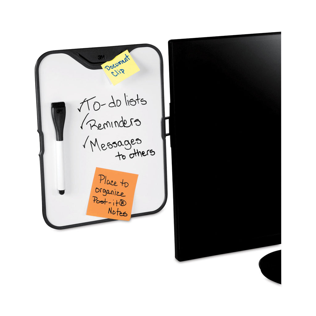Monitor Whiteboard attaches securely to your monitor with Command™ Adhesive that can be easily applied and removed without damage. Features a magnetic attachment system (left- and right-handed), that's easy to detach for quick and comfortable writing. Saves valuable desk space and is at eye level while sitting or standing. Built-in document clip holds up to 10 sheets of paper. Includes a fine tip dry erase marker with a magnetic cap and eraser that attaches directly to the whiteboard.