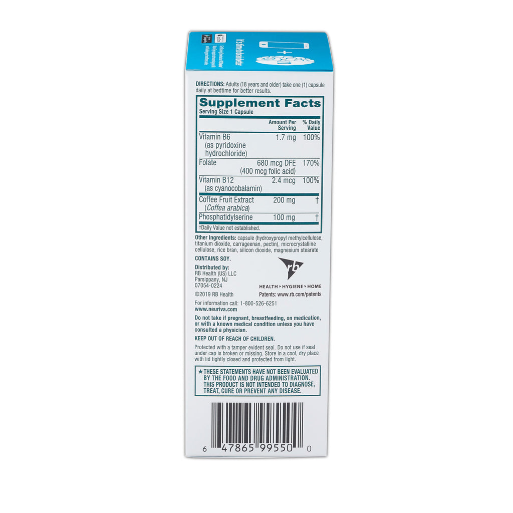 Neurofactor is an all-natural patented, whole fruit extract of the Coffea Arabica plant and is clinically proven to increase levels of Brain-Derived Neurotrophic Factor (BDNF). BDNF is known to strengthen the connections between brain cells. Phosphatidylserine (PS), the second clinically proven ingredient is a phospholipid found naturally in the structure of neurons and cell membranes. Plant Sourced Sharp PS is clinically proven to aid neuron health and fuel memory and learning. Contains Vitamins B6, B12 and Folic Acid to support brain health and cognitive function. Supports six different indicators of brain performance: focus, memory, learning, accuracy, concentration and reasoning.