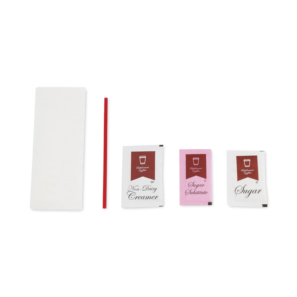 - Kit includes one sugar packet, one sugar substitute, one creamer, one plastic stirrer and one napkin.