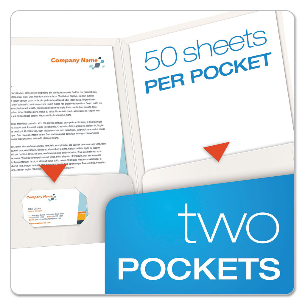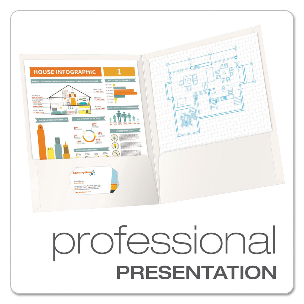 Bright, laminated high-gloss covers get attention. Die-cut business card holder on inside front cover keeps contact information at hand. For 11 x 8.5 sheets. Holds up to 100 sheets (50 per pocket).