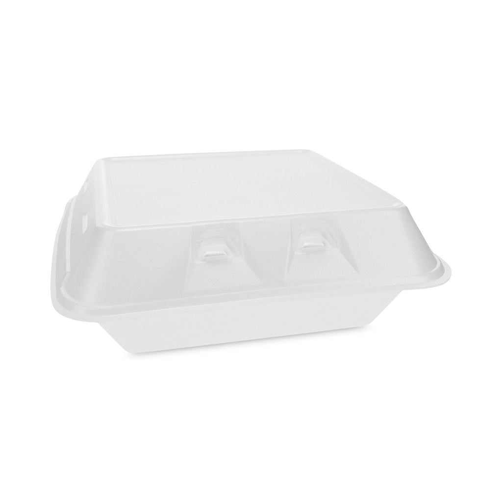 Durable foam construction makes hinged lid containers a perfect lunchtime or dinnertime choice. Containers are insulated to maintain food temperatures at their tastiest. Excellent for use with both hot and cold foods. Dual tab closure ensures that the container is closed. Built in venting allows steam to vent keeping food crisp. Stacking rim increases transport performance.