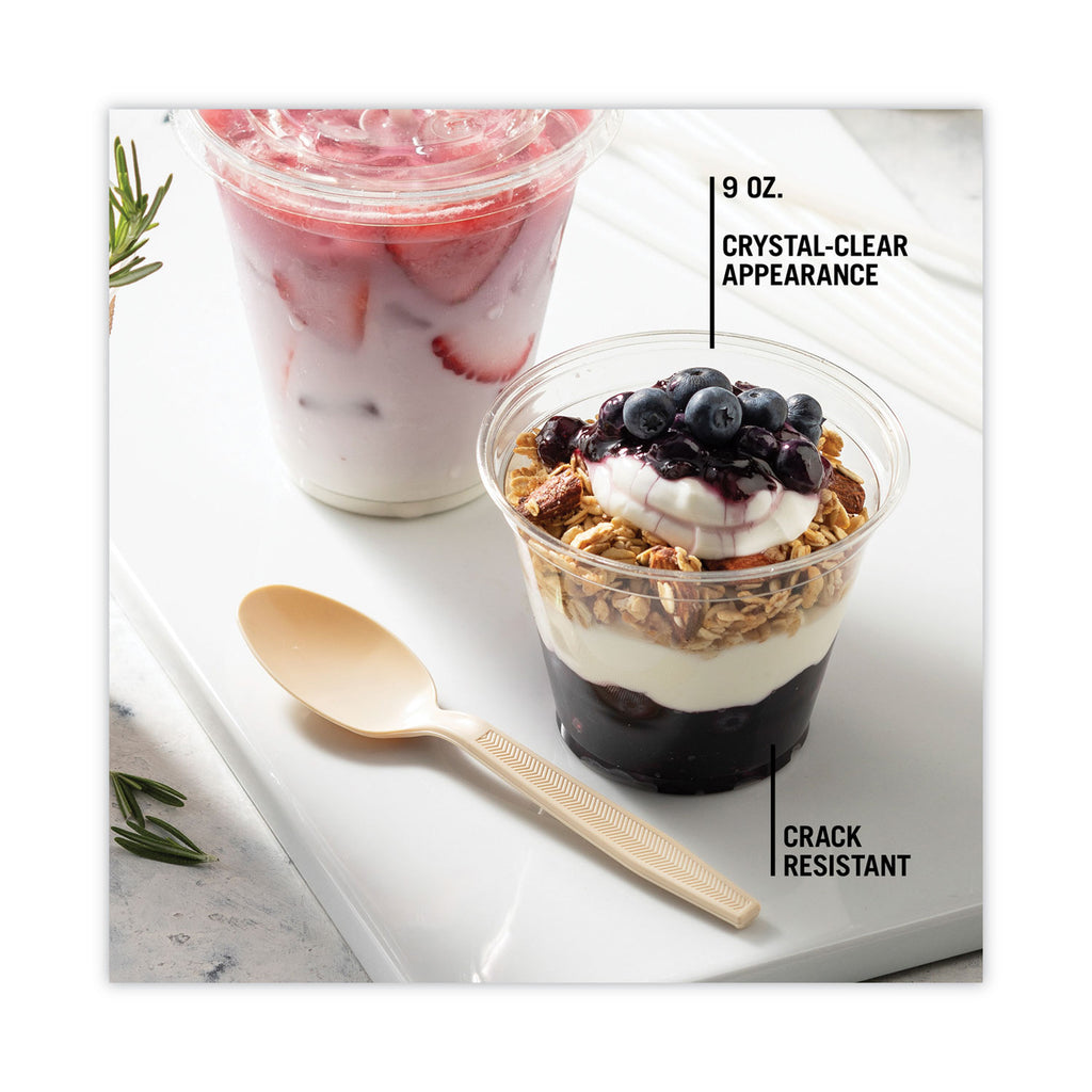 These clear cups provide excellent clarity and a smooth glass like design making beverages quickly visible and identifiable. Outstanding strength resists cracking. Made with recycled drink bottles which helps reduce landfill waste. Perfect for thick beverages such as milkshakes, smoothies, and frozen drinks.