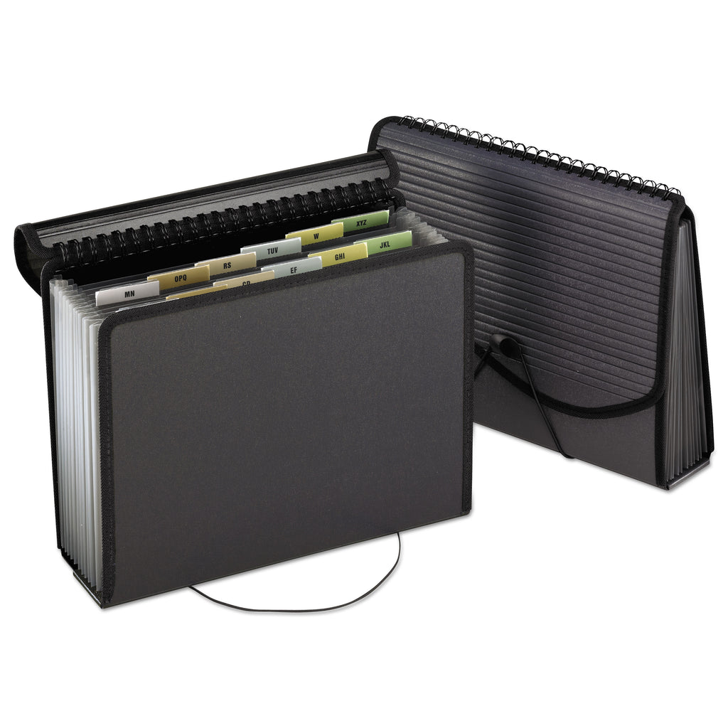 Lightweight, flexible and textured poly is moisture-resistant to protect your documents. Features a patented spiral flap that stays out of the way for easy access. Unique expanding bottom slides out to 4" wide for more holding capacity. Perfect for monthly filing. Secure elastic cord closure.