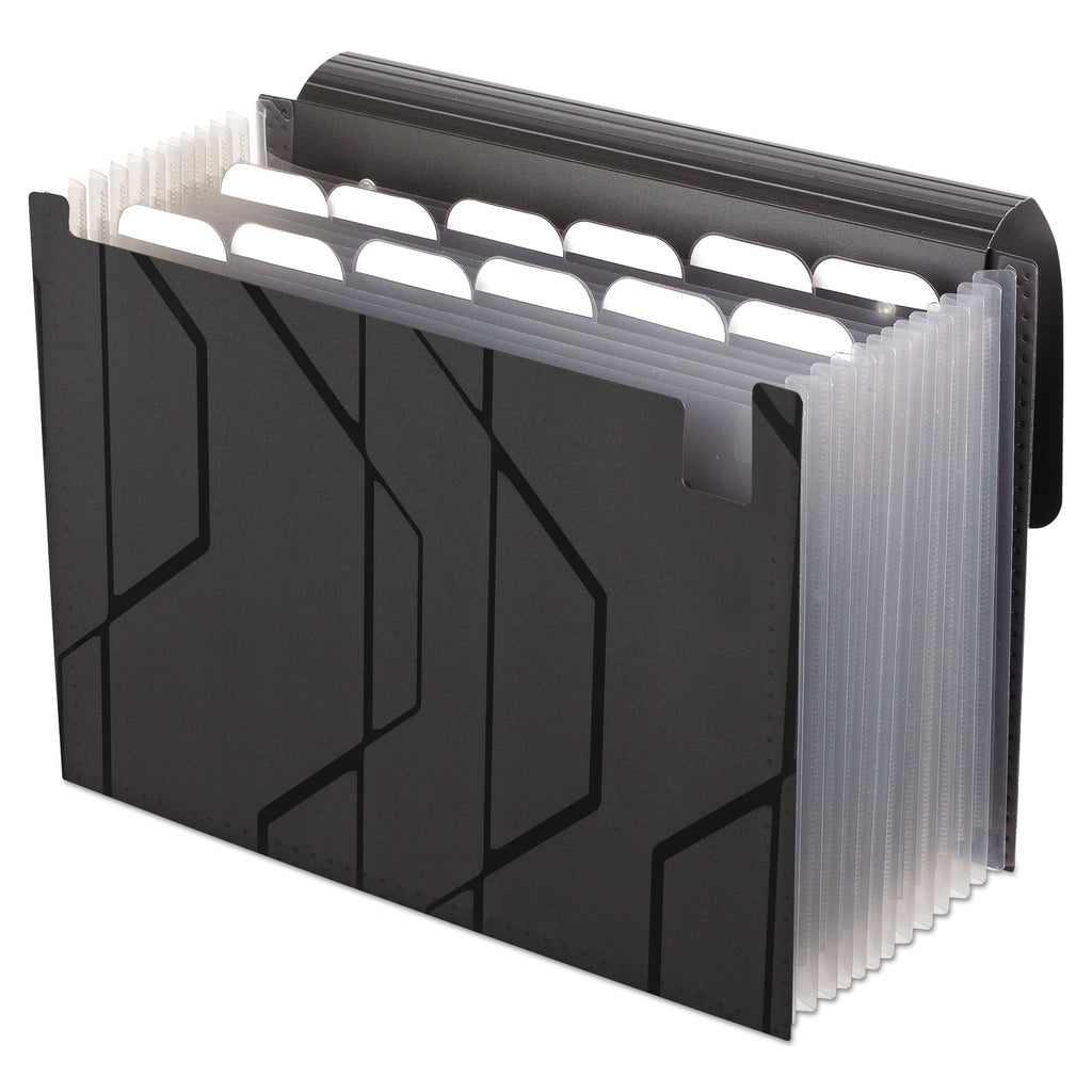 The sliding cover keeps the flap out of your way while you are accessing documents. Expanding bottom allows for additional capacity and also offers the ability to stand up on your desktop. Elastic closure keeps it all together and provides security. Includes blank white self-adhesive labels. Super durable poly construction is wear-, tear- and moisture-resistant.