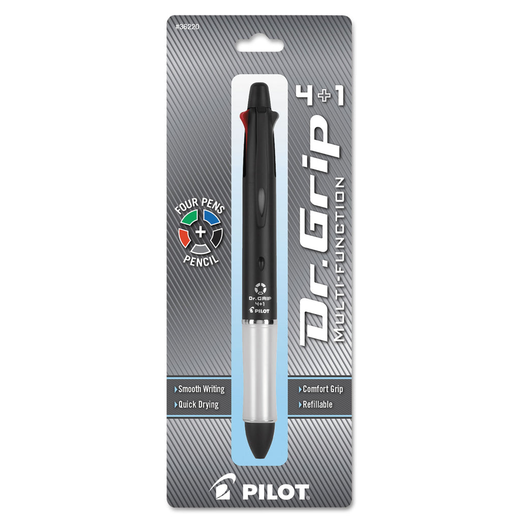 Dr. Grip 4+1 multi-function writing instrument is all you'll ever need! The advanced ink is smooth-writing and fast drying and comes in four different colors. Includes #2 HB lead for strong, break-resistant use. The eraser is concealed under an end cap. Dr. Grip cushioned grip alleviates writing stress and allows you to write on and on!