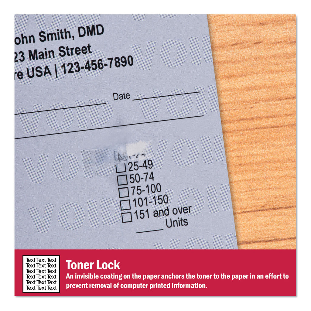 Prevent unauthorized copies and safeguard confidential business, legal, healthcare and personal documents. Designed to meet and exceed federal guidelines for tamper-resistant security paper set by the Centers for Medicare and Medicaid Services. Colored background with erasure protection. Artificial watermark is coin reactive.