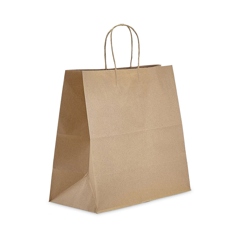 Multipurpose Kraft style paper tote bag is ready for infinite uses: commercial food service, gifting and party favors, shopping, crafting, retail, promotion, and more. You'll find the ideal fit for your bakery, grocery store, school lunch, or wherever else you take these totes. Made from high density weighted paper stock and finished with paper handles. Well-structured with reinforced handles, these bags are designed for holding weight and built to last.