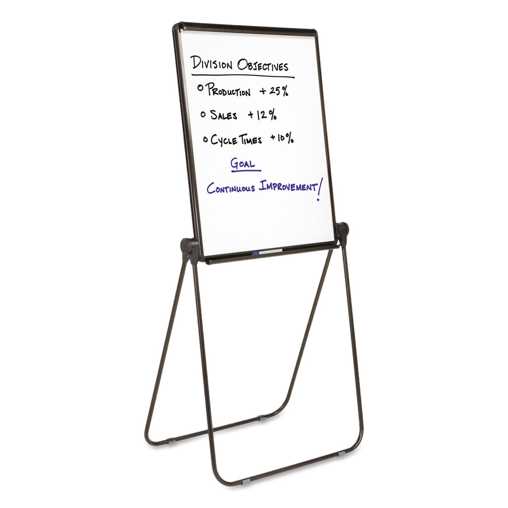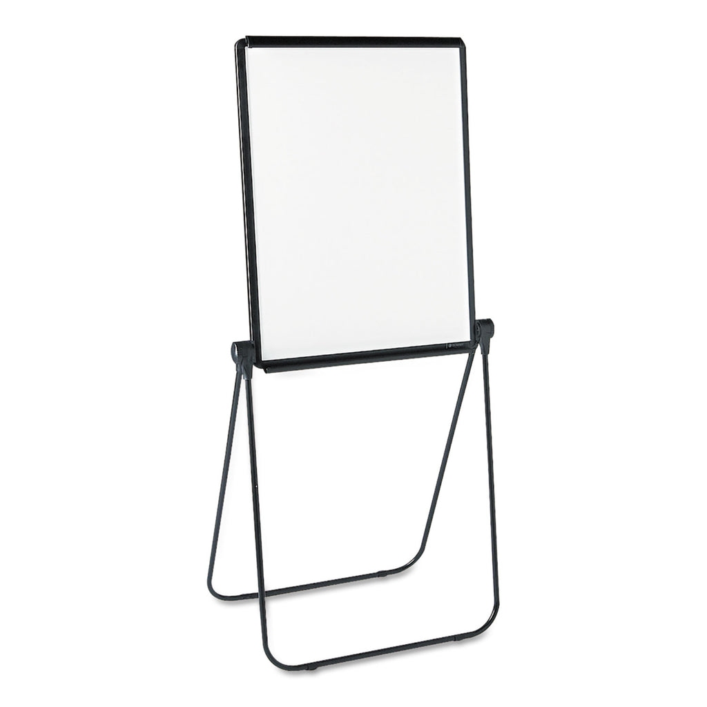 Mobile, dual-sided whiteboard presentation easel is great for multipurpose work environments. The easel writing surface angles easily to enhance visibility and improve communication. Presentation easel features a double-sided melamine whiteboard writing surface. Melamine whiteboard is durable and smooth, but requires regular cleaning for best performance. Easel itself stands 70" tall. Ideal for light use in multipurpose office spaces.
