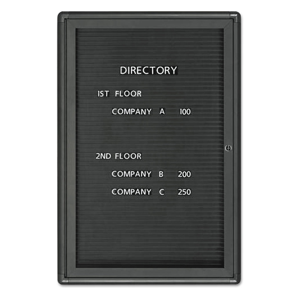 Protect and preserve important communications with the Quartet® Radius Design Letter Directory. The shatterproof window and locking door make the enclosed letter board an ideal place to safely display messaging in indoor environments. The hard-working surface holds messages securely in place. White plastic letters (sold separately) stand out on a solid black background for maximum readability. The durable, powder-coat finish delivers long-lasting, attractive performance. The lightweight, aluminum frame helps makes the directory easy to install.