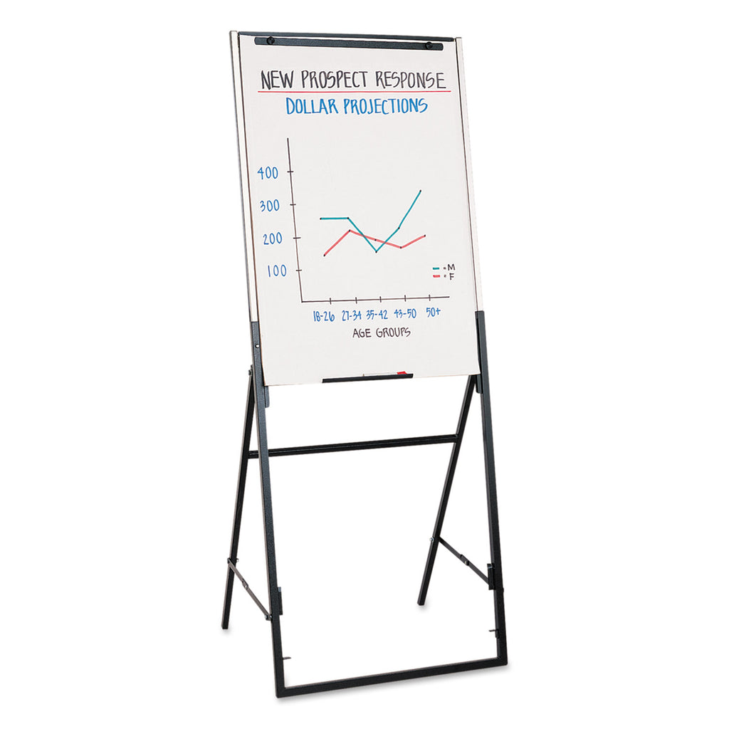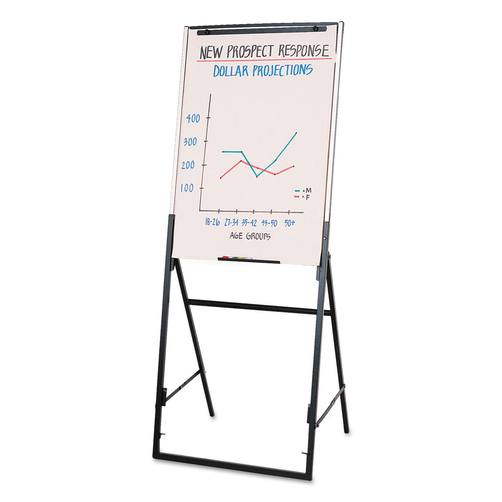 Easel adjusts from 40" to 67" in height at the touch of a button. Whiteboard writing surface provides a smooth presentation platform for low-use environments. Great for collaboration purposes. Regular cleaning using Quartet® cleaning solutions will extend the life of the whiteboard surface. Features a flipchart holder and marker tray. Black-frame easel folds for transport and storage.