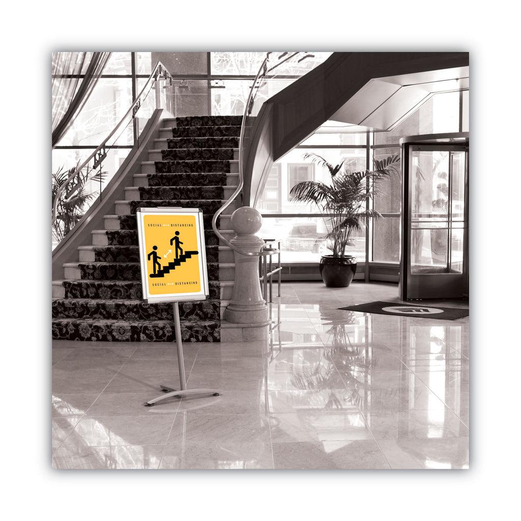 Freestanding, pedestal base sign elevates posters to keep them easily visible in busy environments. Clip frame unhinges for faster sign changes. Durable, freestanding, pedestal base sign with rounded corners. For use in high-traffic spaces such as lobbies or restaurants. 54" height, holds posters up to 18" x 24". One easy flip unhinges clip frame to quickly update signage. Included frosted plastic overlay reduces glare. Silver, aluminum base with adjustable levelers.