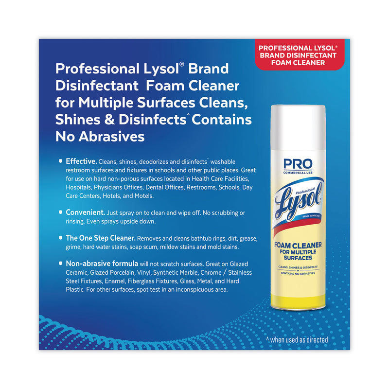 This rich foam clings to surfaces to kill Staph, Salmonella, Pseudomonas, E-coli HIV-1 (AIDS Virus) and other germs on hard, nonporous surfaces when used as directed. Its unique aerosol valve allows spraying from any position—even upside down to clean, shine, disinfect and deodorize. This product eliminates odors and prevents growth of mold and mildew. Use on fiberglass, glazed porcelain, synthetic marble, glazed tile, hard plastic and vinyl.