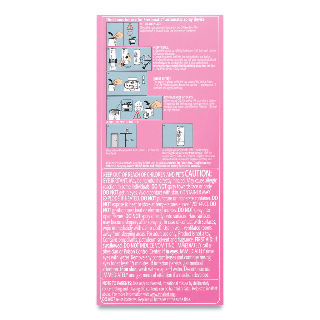 Automatically releases fresh bursts of fragrance with three fragrance intensity levels to choose from. The automatic spray neutralizes odors and diffuses a fresh and wonderful fragrance. Contains no added water which means more fragrance in the air and less on the floor.