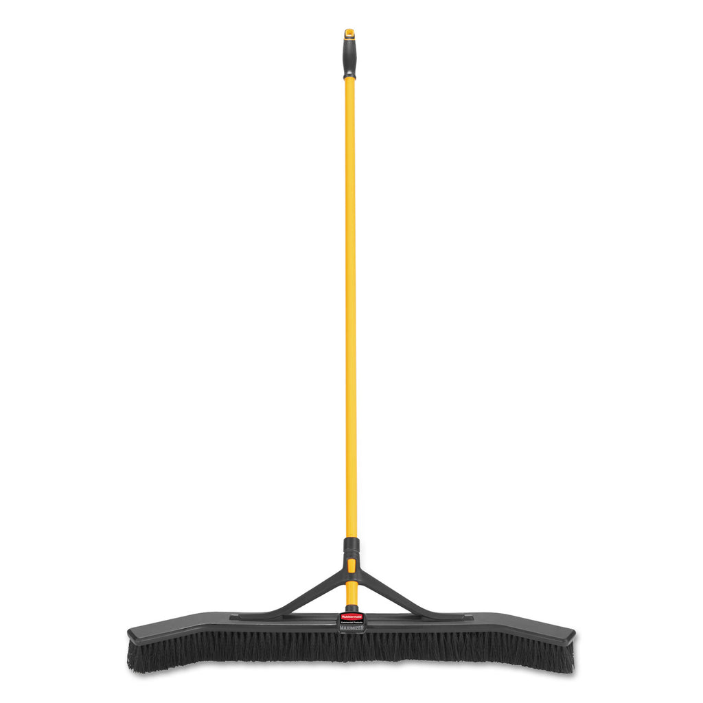 Angled sides capture more debris per stroke than standard push brooms. Polypropylene foam block resists cracking, splitting, warping and rotting. Bristle broom has a lightweight steel handle with supporting yoke, holds up to repeated use. Molded comfort handle grip reduces strain.