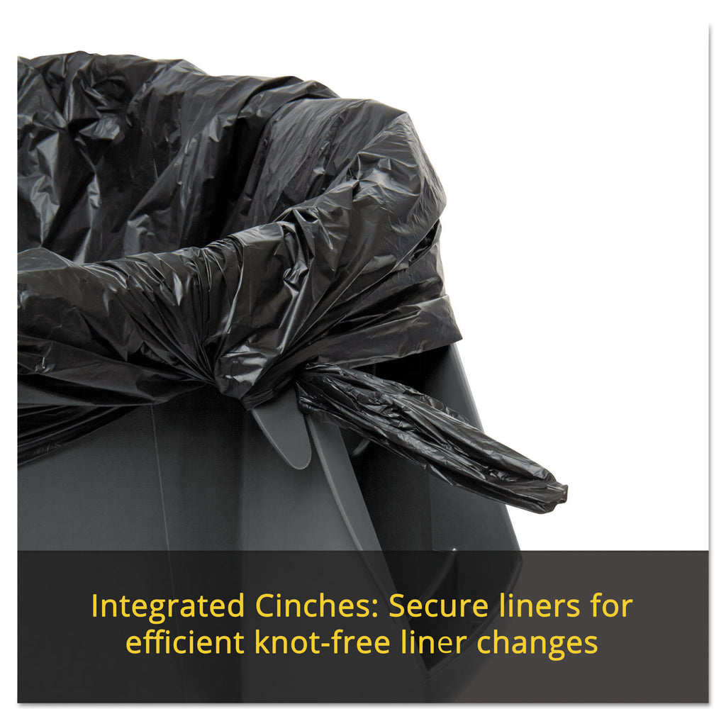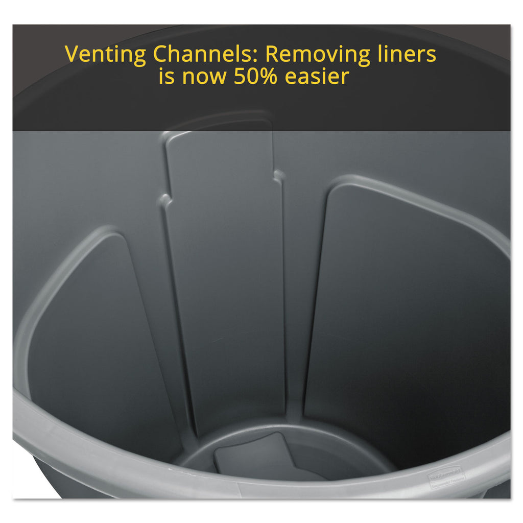 Sets the standard for reliable garbage collection in high traffic areas. Built tough and versatile, these garbage cans feature revolutionary venting channels that let air flow into the receptacle making liners up to 50% easier to remove. Integrated cinches allow bags to be attached to handles without knots for faster liner changes while contoured base handles and rounded top handles make it easier for staff to lift and transport these receptacles in any facility. Constructed of the high-quality materials, these crush-resistant garbage cans have heavy-duty, reinforced bases that hold up even when dragged across rough surfaces. These trash cans are stackable to save space and provide an unbeatable value with their easy-to-clean, seamless construction, UV inhibitor, and do not fade, warp, crack, or crush.