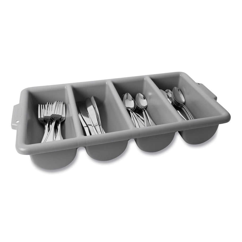 Four-compartment bin is ideal for storage or dispensing cutlery and condiment packets. Ribbed design and special resin material provide strength. Has comfortable handles. Dishwasher safe; NSF certified.