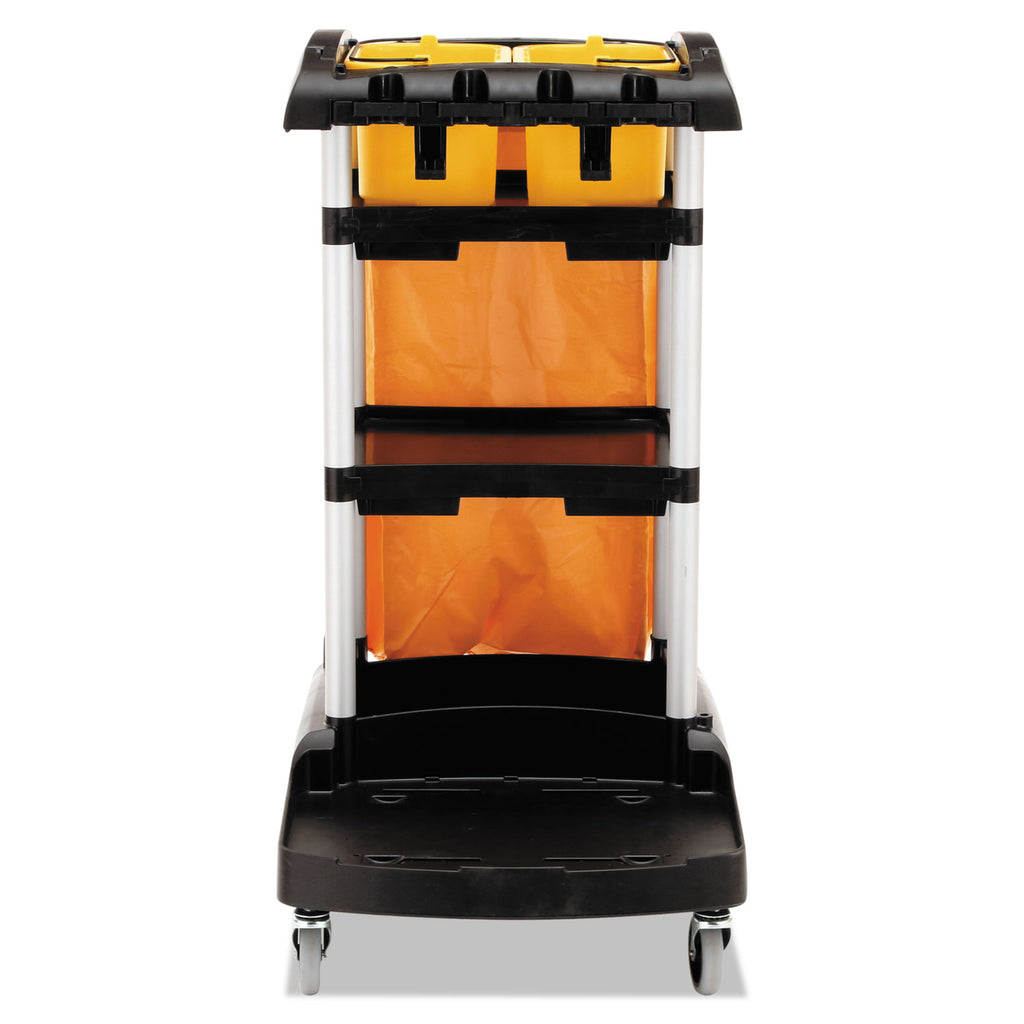 The Rubbermaid Commercial Products High-Capacity Janitorial Cleaning Cart provides flexible, high-capacity storage and tool organization. This housekeeping cart has two caddies, a zippered yellow bag, and 5 cubic feet of storage. The maid cart has an aluminum frame with plastic shelves for corrosion resistance and an overall lightweight body, and it has an integrated handle for push-pull maneuverability through commercial doorways and onto elevators. The housekeeping cart includes two removable 10-quart pails that fit into compartments on the top and also provides rubber tool grips to hold up to five brooms, mops and other stick cart accessories. The cleaning cart has hooks for hanging up to four safety signs and a bucket attachment that locks a wheeled bucket to the cart for convenience (bucket sold separately). It has two 8" rubber wheels and two 4" swivel casters for use on most flooring types.