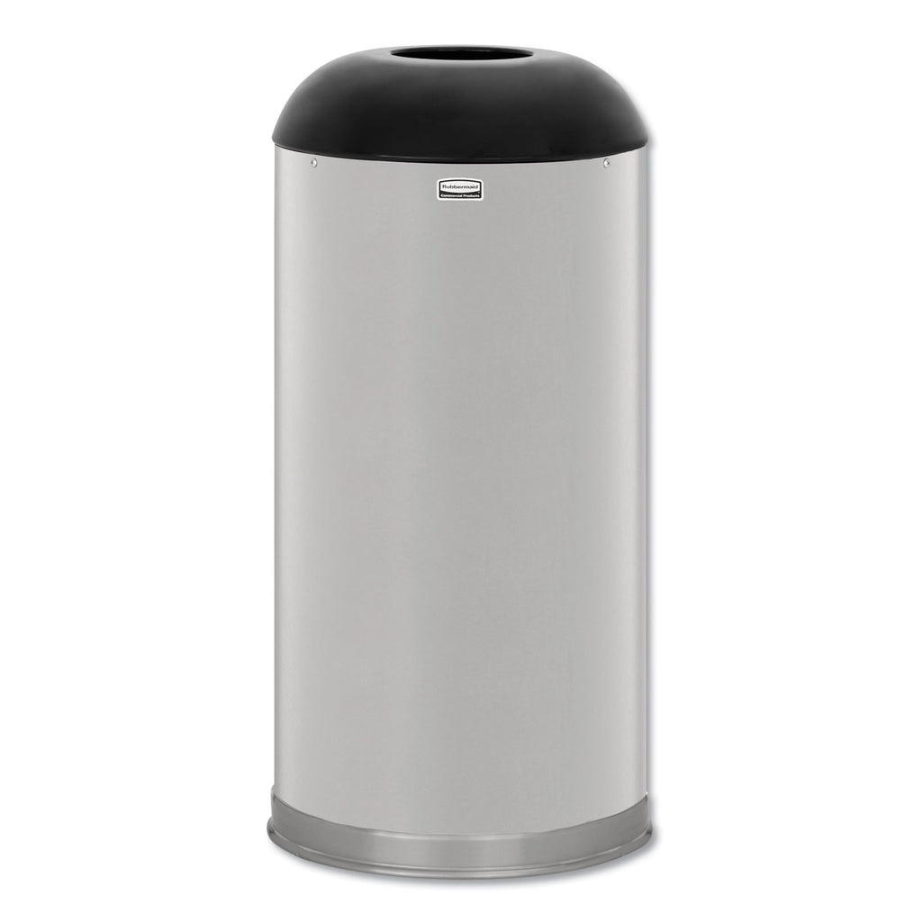 Waste stays put after it's placed through 5 1/2" dia. disposal opening. Recessed side handles for easy emptying. Galvanized steel liner. Elegantly trimmed satin finish hides fingerprints, smudges and scratches. Noncorrosive base ring protects floors. Durable fire-safe construction.