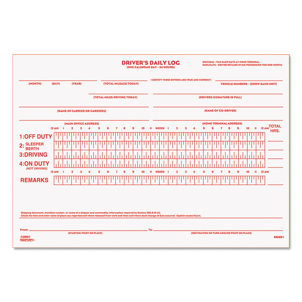 Log a day's driving summary in separate section at right side of each form. Vehicle report on back of original with odometer start and finish, mileage today, time in, stops, time out, layover time, daily vehicle inspection report.
