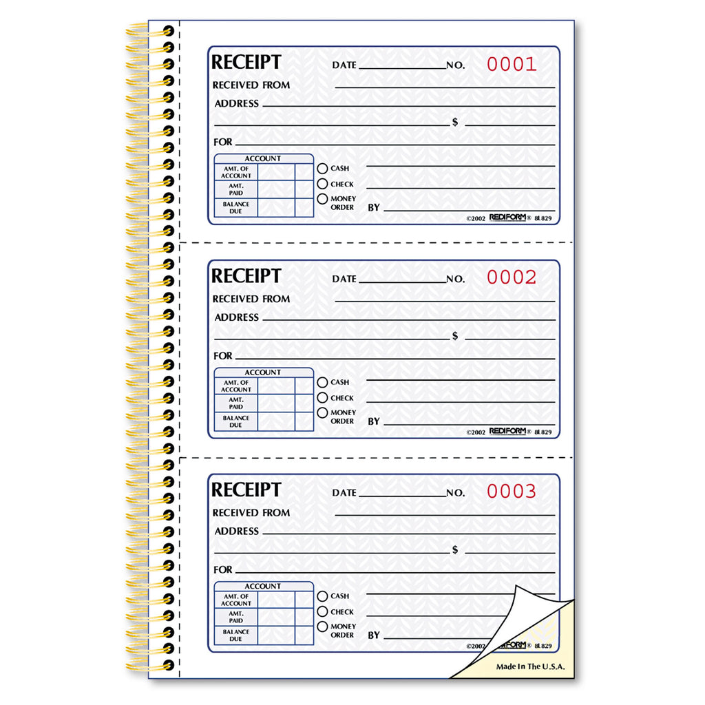 Safety tint on original rubs off if erased. Coordinating gold twin-wire binding allows book to lie flat when open. Attached stop card prevents write-through onto other receipts and is always handy. Account and check-off boxes for cash, check, money order.