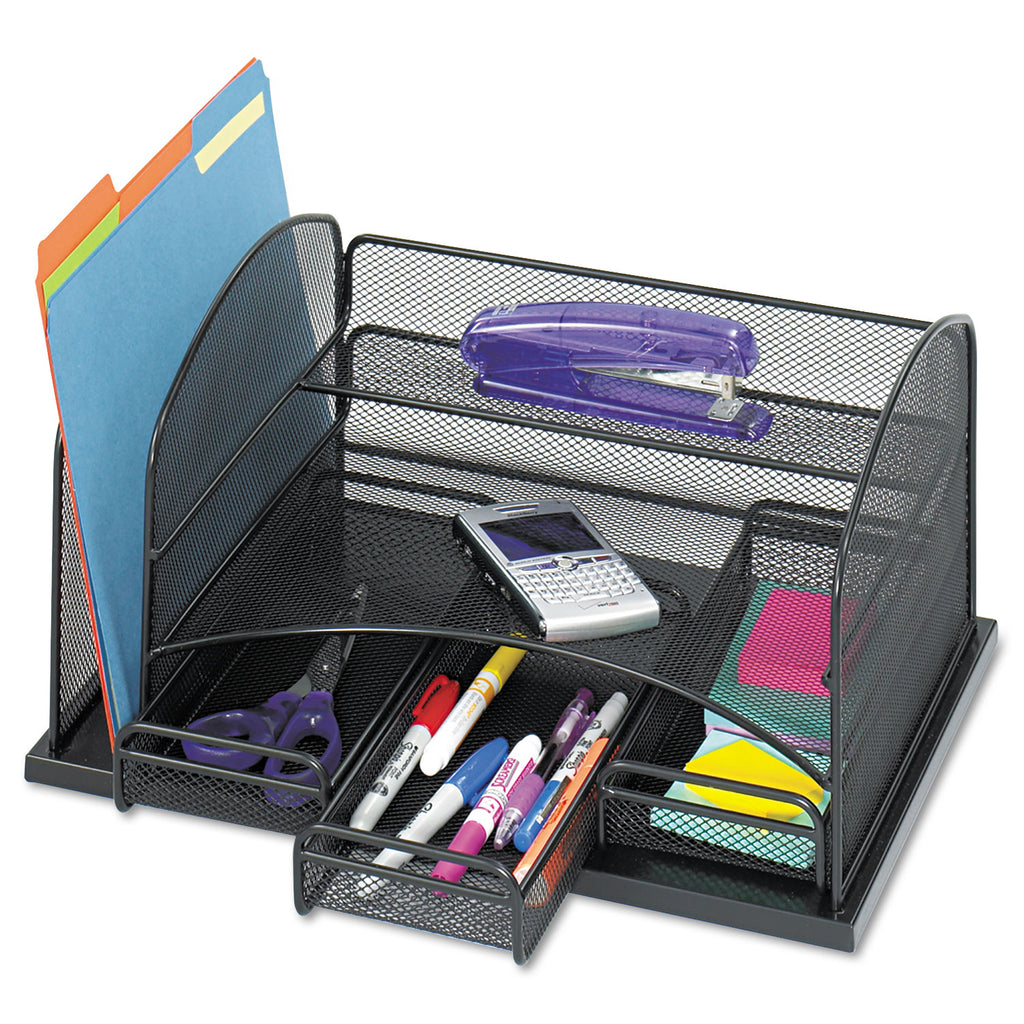 Store folders, pads, scissors, pens and more all in one well-designed organizer. Keep your desk essentials off your desk but within easy reach. Features one 2" section for a binder or folders, two trays and three drawers. Steel mesh construction is durable, strong and stylish enough for any decor.