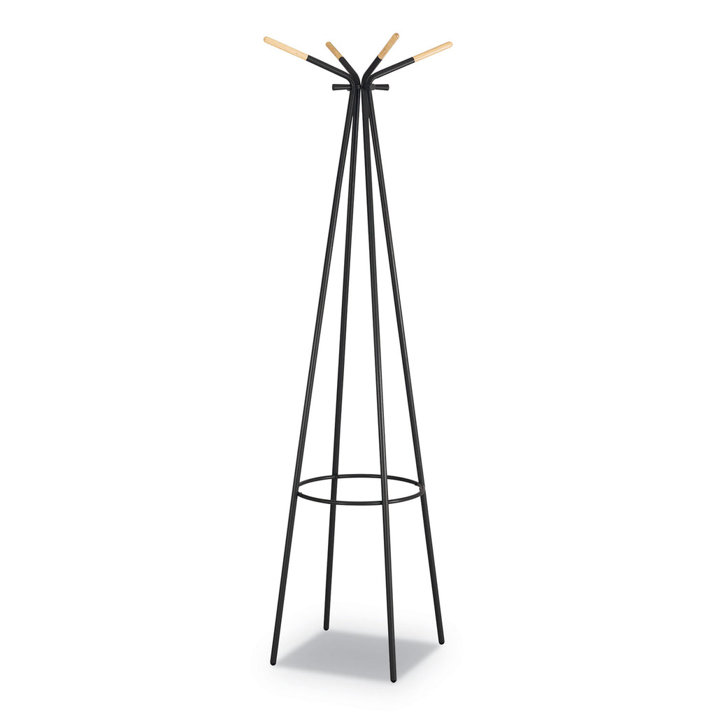 The rounded edge hooks of the coat rack helps protect garments. Ring provides storage for umbrellas. Four wood tip garment hooks.