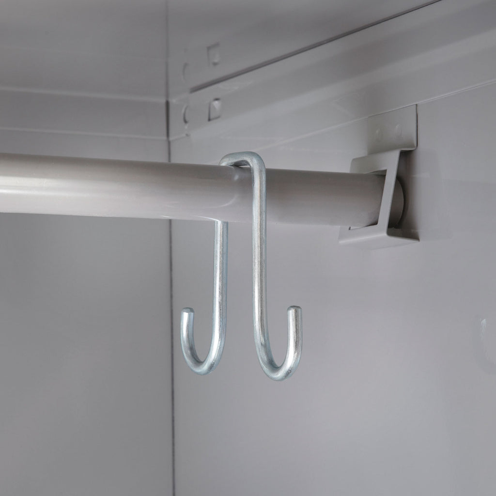 Heavy gauge, all-steel construction and strong uni-body design stand up to tough conditions. Convenient storage with shelf, bar and double hook. Raised 6" off the floor for easier access and perforated for ventilation. Recessed handle with padlock provision has no protruding parts. Fully assembled units can be linked together for greater capacity.