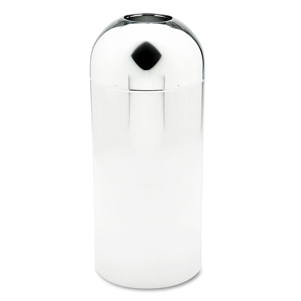 15 gallon dome receptacle with an open top and galvanized steel liner. Wide stainless steel bottom edge is rolled under to protect floors. 6" dia. opening for drop-in convenience. The unique design increases hygiene by preventing hands from touching spills.