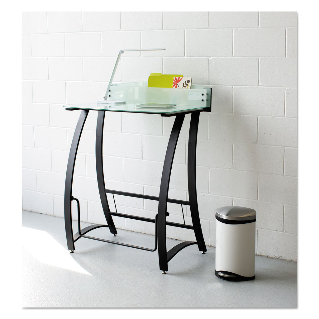 Step-on, hands-free receptacle features a unique shape that makes it easy to place in corners, helping save valuable space. Finish helps to protect against fingerprints. Slow-close lid prevents slamming, ensuring a quiet close. Includes a convenient rigid-plastic liner with built-in bag retainer.