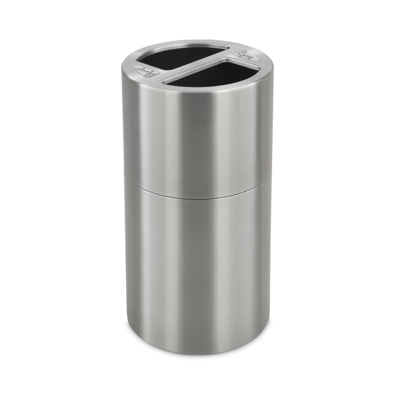 Keep your recyclables separated with this two-bin system. Easily customizable and includes recycling decals: plastic, cans, paper and waste. Removable lid provides set-up versatility. Aluminum body with two 15 gallon, separate plastic liners. Satin finish makes it perfect for use across the workspace.