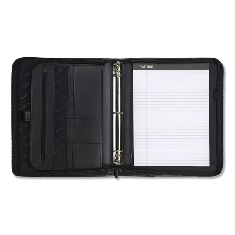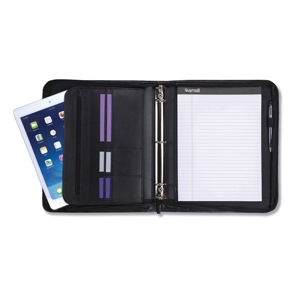 After considering the needs of modern-day professionals, we, at Samsill, are happy to say that we've come up with an organizer to make your life at work more comfortable and stylish, all thanks to our well-received Samsill Professional Binder Padfolio. Flaunt a smart look wherever you go with this stylish Professional Ring Binder Portfolio with Zippered Closure Case. A perfect companion to your flourishing business life, this briefcase-style portfolio offers utmost sophistication and style while it also helps you stay organized for all the important moments in your life. To put it simply, it's the only pad folio you'll ever need. It uses synthetic leather that carries the feel and look of premium Napa Leather to help you make a positive and lasting first impression. Its minimalist design is a perfect fit for all environments – from Fortune 500 boardrooms to university classrooms. Safety first! The business portfolio is designed with a smart zip-around closure that ensures complete safety of all your gadgets, documents, and other business accessories kept inside. Carrying your tablet along? No problem! Our business portfolio includes a 10.1-inch built-in padded tablet sleeve that can hold most tablets out there Stay organized while the exterior has two large storage pockets, it opens to reveal an inside document pocket, business card pockets, and accessory pockets. This business case is equipped with a 1-inch round ring that can comfortably hold up to 225 paper sheets. The expandable document pocket helps you store anything and everything from loose pages, letters & envelopes to leaflets, invites and personal IDs. Wand to take some quick notes? We've got you covered with a refillable letter-sized writing pad and a pen loop.