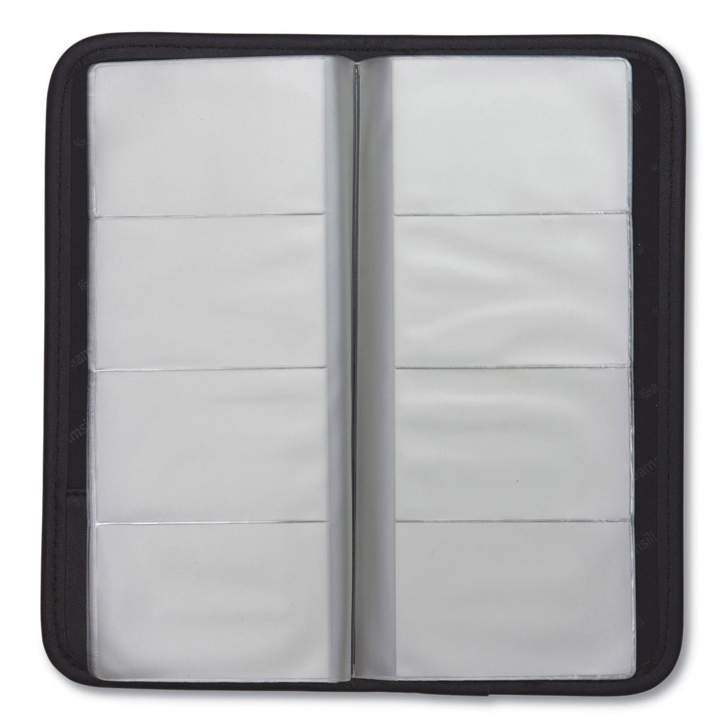 Soft, leather-like vinyl, a padded cover, stitched edges and rounded corners give this business card case a rich look. Pocket on inside front cover. Securely fit business or credit cards in 160 individual slots distributed over 40 different 4-high non-glare plastic pages that allow clear card readability. One additional slot inside for other frequently used cards/notes.