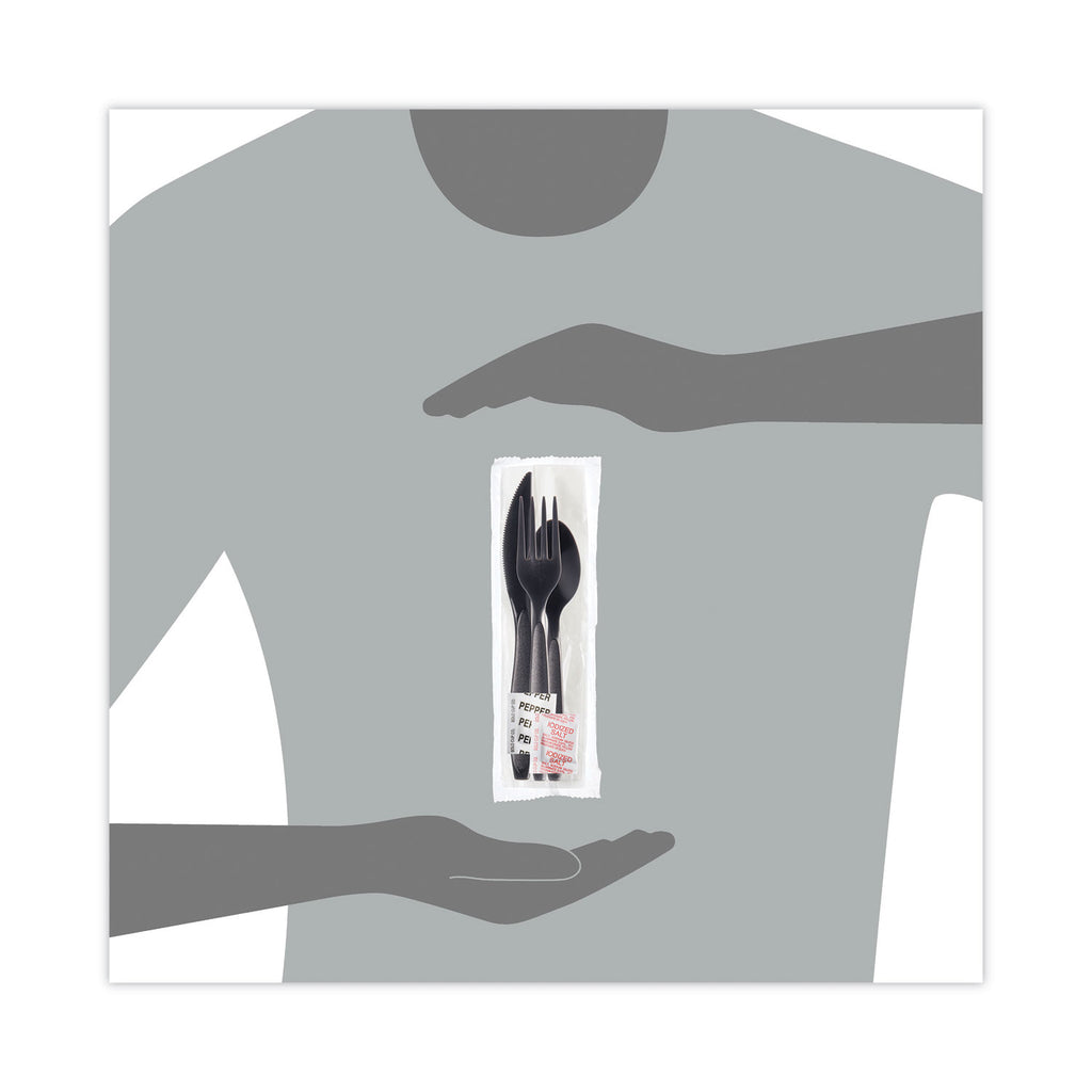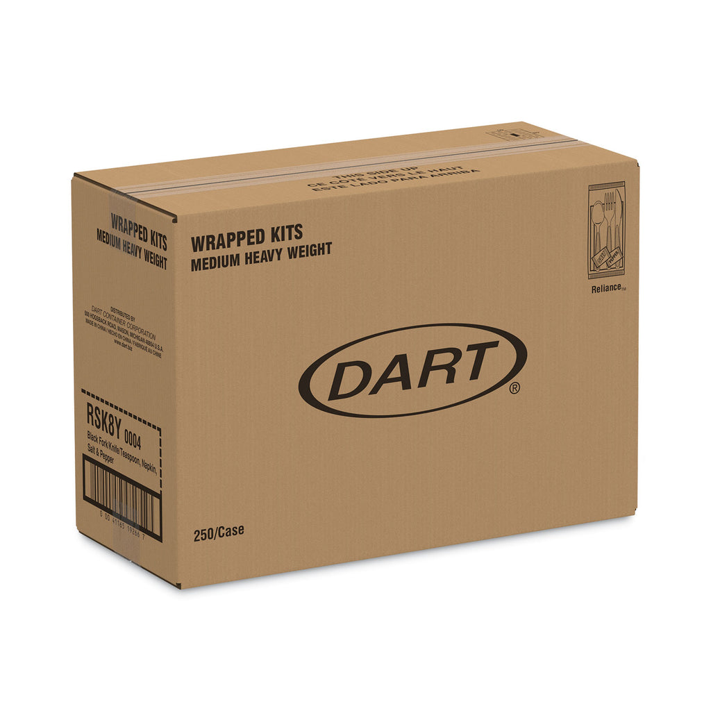 | Package Includes | (250) Wrapped Kits, Each Kit: (1) Knife, (1) Fork, (1) Spoon, (1) Napkin, (1) Salt, (1) Pepper |