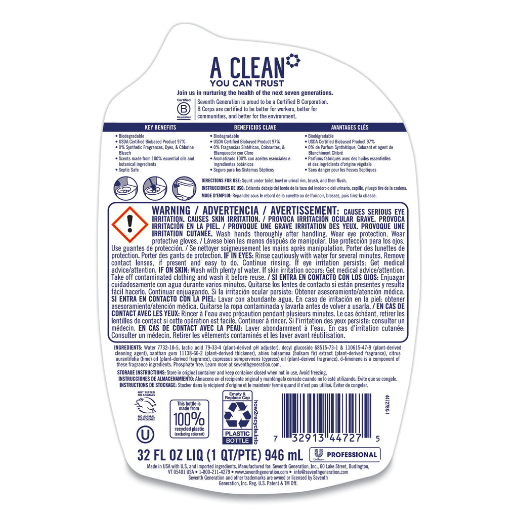 This plant-based formula attacks stubborn stains without chlorine bleach and freshens every toilet bowl with an Empress Cypress and Fir scent made from 100% essential oils and botanical ingredients. this toilet bowl cleaner gets the job done with a septic safe, biodegradable (biodegrades in 28 days) formula with no dyes and no chlorine bleach. Made from 97% biobased ingedients. Bottle is made with 100% Post-Consumer Recycled (PCR) plastic. Ideal for commercial use including restaurants, offices, day care facilities, schools and hospitality.