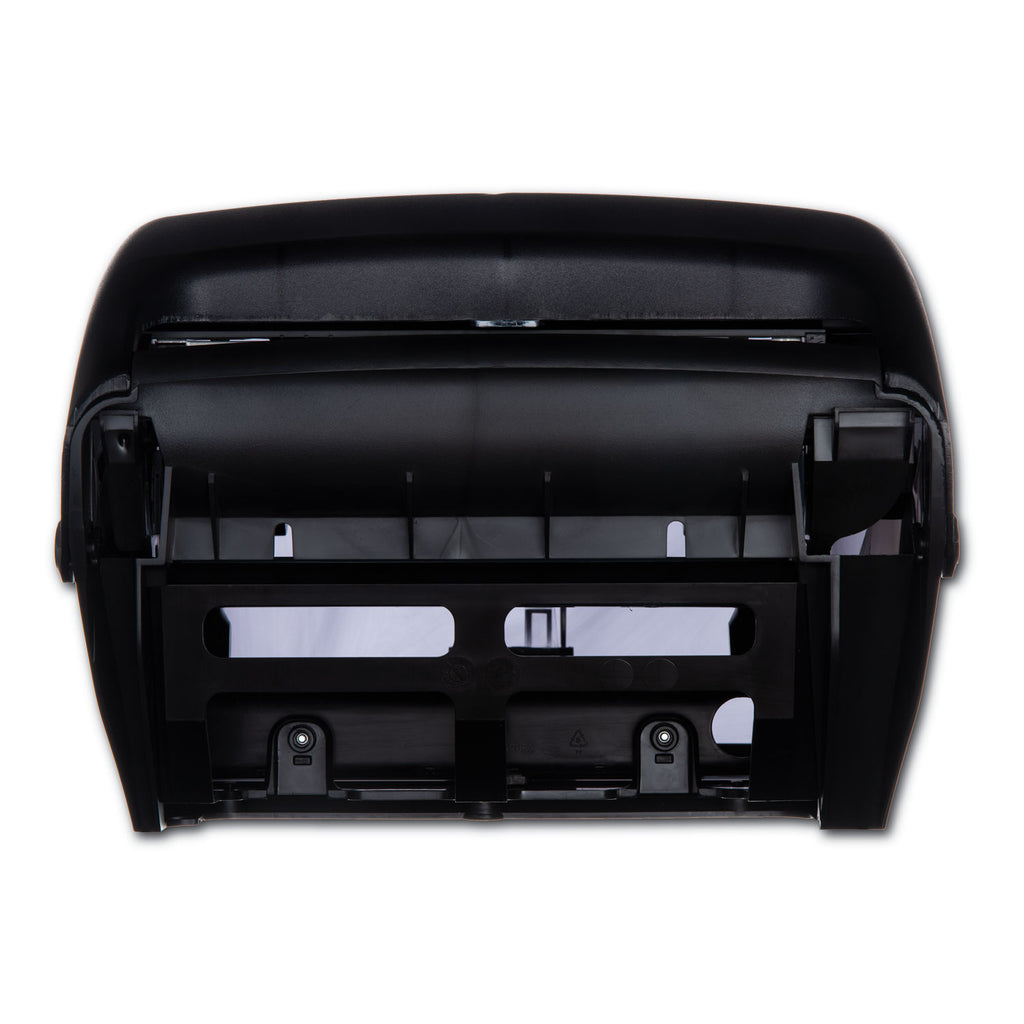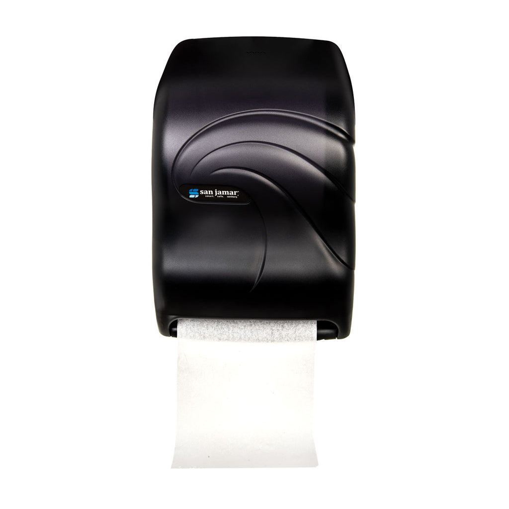 Sanitary touchless dispensing prevents germ spread. Just tear off towel and sensor activates to present another! Portion control provides 10” length every time. Dispenses all qualities of paper without jamming. Holds rolls up to 8” wide x 8” dia. and one 4” stub roll. Automatic transfer device allows complete usage of stub roll to eliminate waste. Lock prevents pilferage. Operates on four D alkaline batteries (sold separately); battery usage equivalent to dispensing 100, 800-ft. rolls. Impact-resistant plastic.