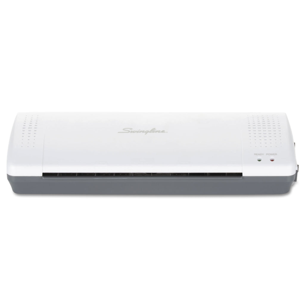 Provides high quality laminating and is incredibly easy-to-use. A single power setting laminates 3 or 5 mil pouches. A power indicator and a ready indicator light clearly let you know when you can begin laminating. Warms up in four minutes and laminates any item up to 9" wide. You can also select cold lamination for use with pressure-sensitive, self-adhesive pouches. With a laminating speed of 9" per minute you can remain productive and still protect all your important documents and favorite photos. A jam release lever is included to easily correct alignment of misfed pouches. Delivers high-quality lamination for basic home, crafts or personal business use. A starter pack of 5 letter-size, standard thickness pouches is included.