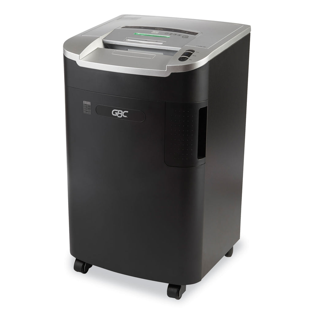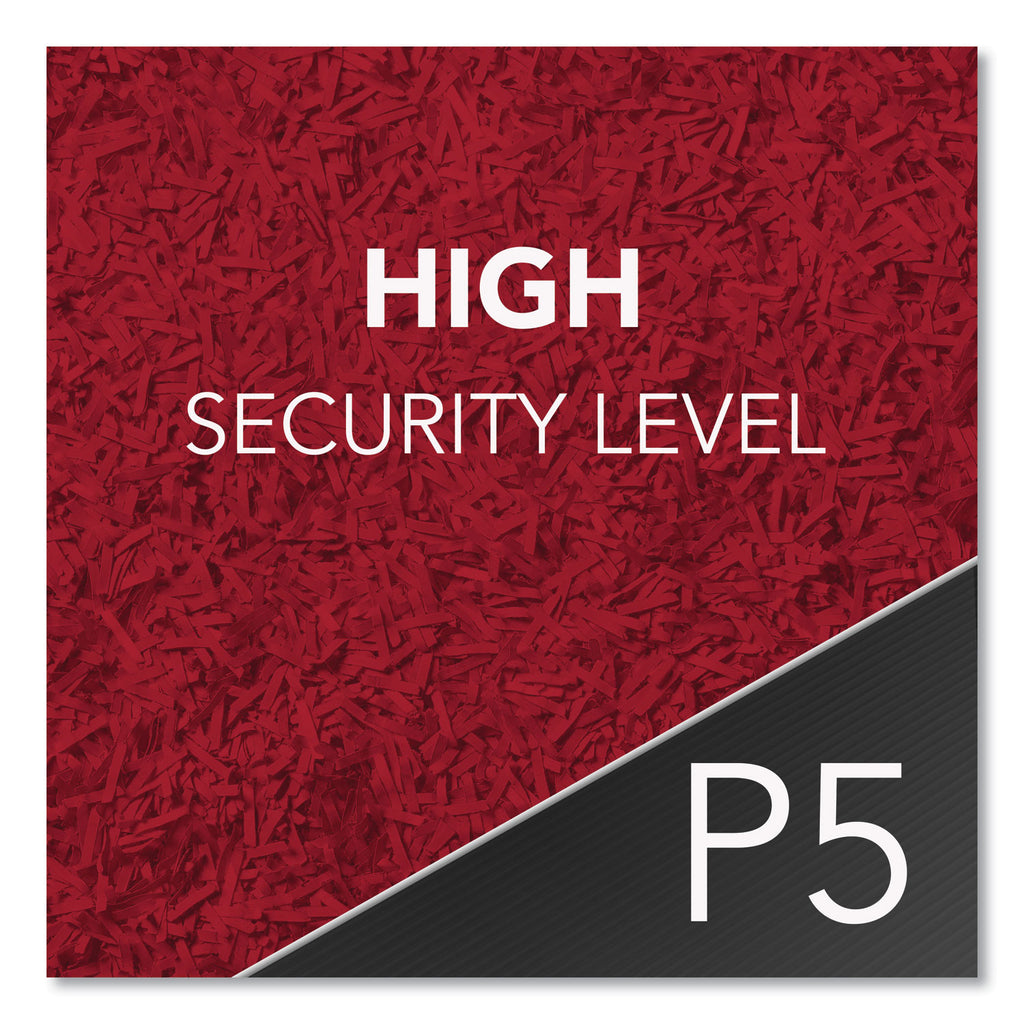 Eliminate mess and paper clutter with this high-quality micro-cut shredder. P-5 Level Security shredder meets high security needs. Ideal for sensitive documents. Red and green LED lights indicate when shredder reaches feed capacity. Feature prevents users from inserting too much paper into shred area, stopping jams before they occur. Continuous duty run time allows you to shred more paper, faster, and the ultra-quiet function, below 60dB, ensures minimal disruption in shared spaces. Intelligent SelfOil extends cutter life. Self-Cleaning Cutters auto-remove shreds that can lead to jams, and the Intelligent Power Save function helps conserve energy. Extra-large, 30-gallon pull-out waste bin, with bin full indicator. Shreds up to 12 sheets at a time. Also shreds DVDs, CDs, credit cards, paper clips and staples.