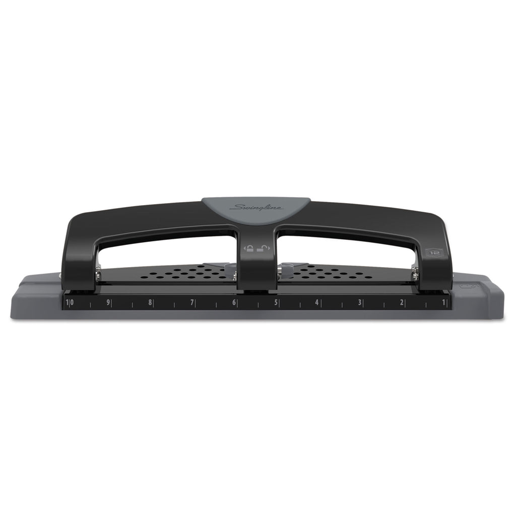 The manual, low-force design reduces the amount of effort needed to create clean holes by up to 40% when compared to a standard paper punch. Fixed heads easily punch sheets. The soft grip handle not only makes it more comfortable, but also locks down to allow for more compact storage when not in use. A hole pattern in the punch base provides visibility into chip tray to see when it is full. An opening in the back and a removable base allow two options for quick and easy emptying of paper chips. Built-in ruler and edge guide deliver perfectly aligned punching of 9/32" holes. The perfect spacing helps you easily insert sheets into ring binders, folders and report covers. The durable metal construction is long lasting.