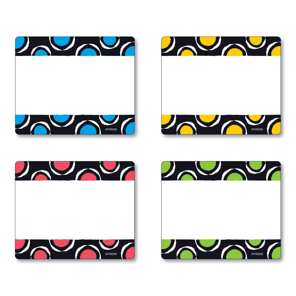 Colorful and bright adhesive labels. Designed for smear-free writing with markers or pens. Coordinates well with other TREND® themed products featuring Discovering Dinosaurs™, Sea Buddies™, Sock Monkeys™ and more. Perfect for personal name tags or labeling lockers, doors and storage boxes. Won't leave residue on clothes or surfaces.