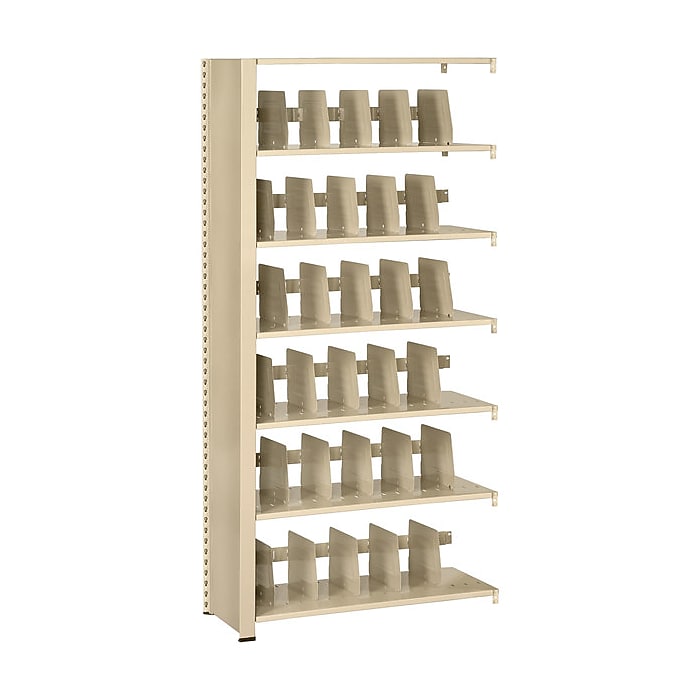 Designed to protect your flooring, the unit's carpet-friendly molded polyethylene feet provide a stable, non-damaging base. The strong steel shoulder rivets, uprights, and shelf supports contribute to its impressive 300 lbs weight capacity per shelf. This add-on unit seamlessly integrates with your existing shelving system to offer increased filing and storage space.