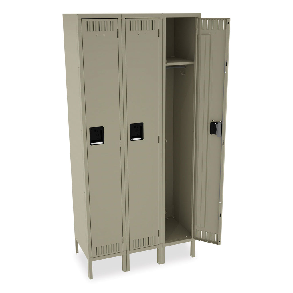 Single-Tier Lockers are ideal for schools, industrial facilities and office settings. Heavy-gauge steel construction and extra-strong five-knuckle hinges with secured hinge-pins help ensure rigid, reliable, long-lasting performance. Vertical louvers provide excellent ventilation. Inset handle design allows padlocks to be recessed to keep them from protruding into aisles and hallways. Door closing noise is effectively dampened with carefully placed bumpers. Multiple locker units can be ganged together into rows using standard nuts and bolts (additional units and ganging-hardware sold separately).