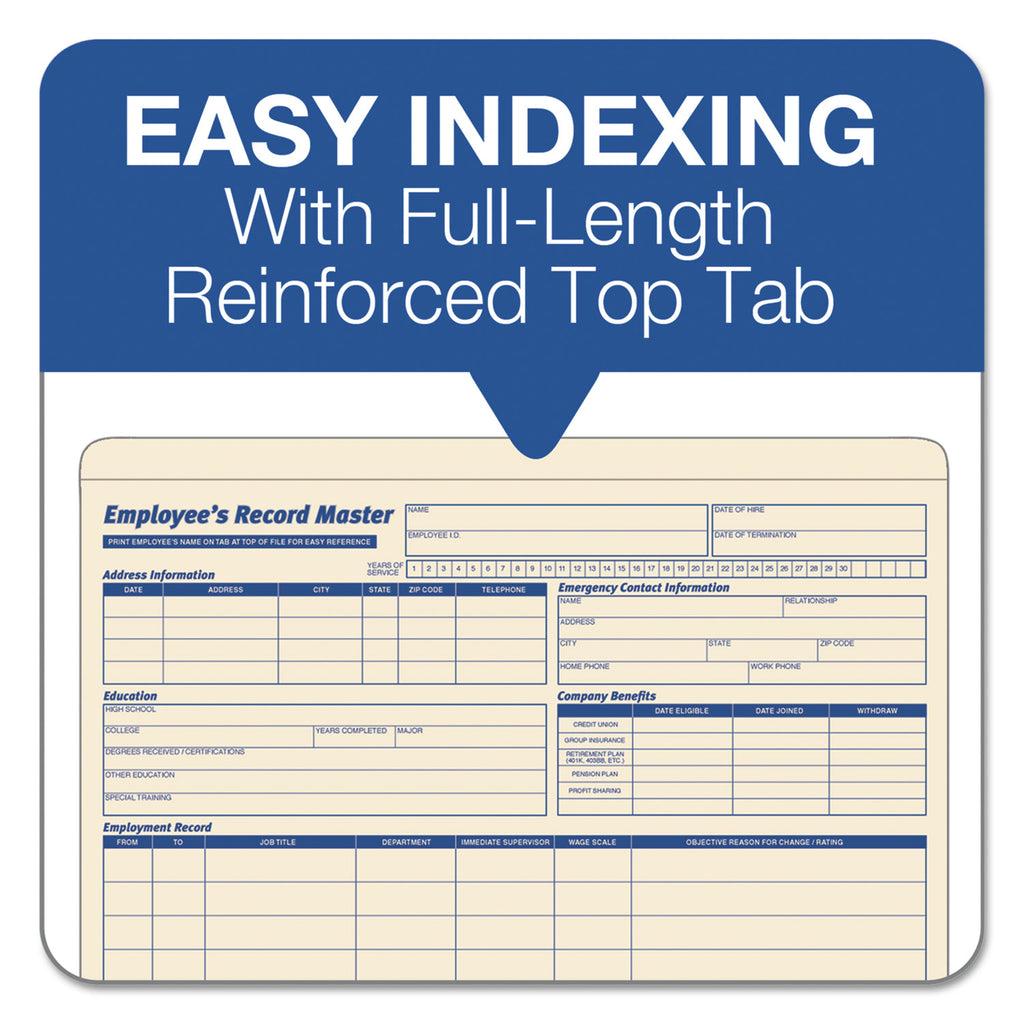 Effectively organize all pertinent personnel documents for each employee. Record and update employment history on the preprinted front side. Holds pre- and post-hiring forms. Closed sides. 10 pt. Manila. Provides space for company benefits, education details and employment records.
