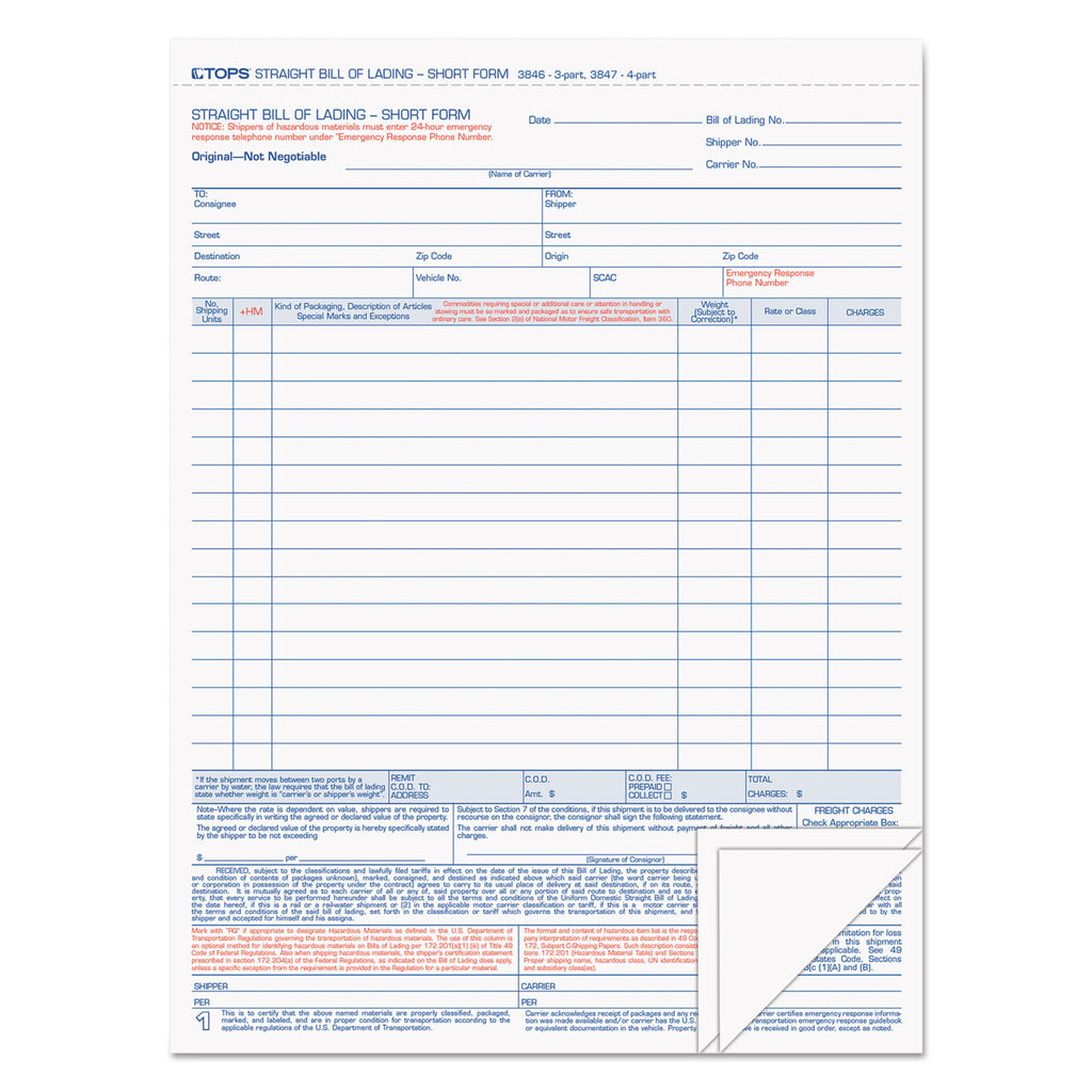 Adaptable to all types of shipments to any location in the country. Simplified form to itemize 16 articles. Headings for article descriptions, shipping units, weight, rate and charges.