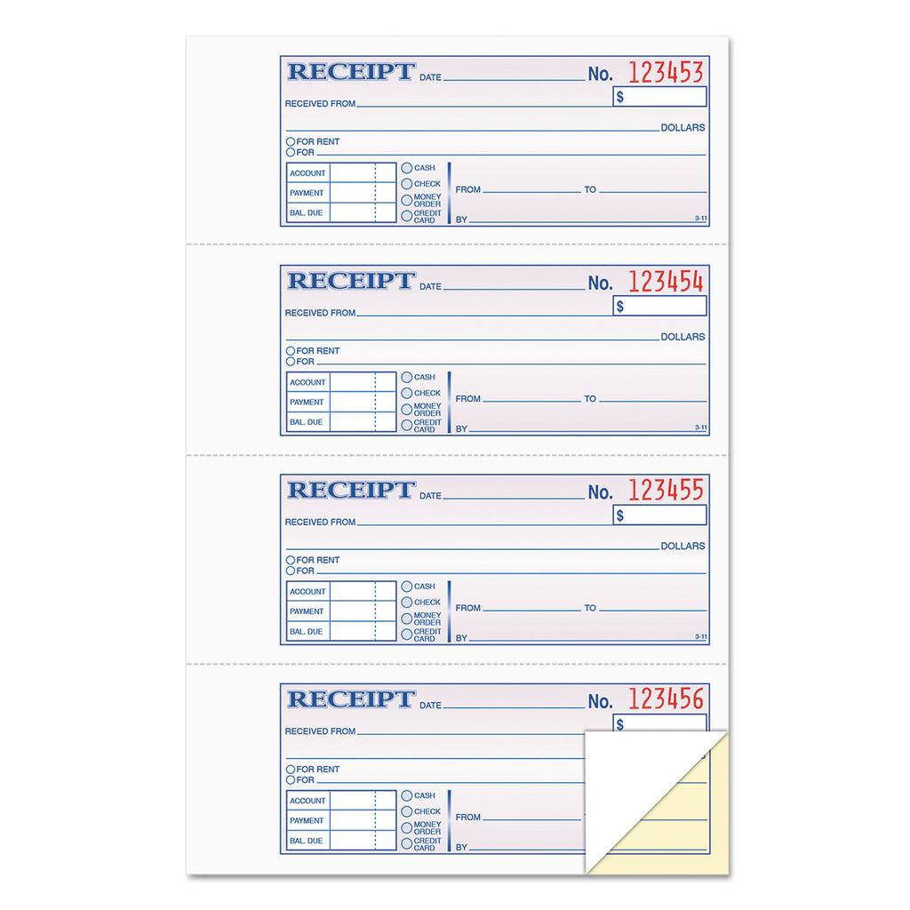 Use to record monies received. Consecutively numbered in red. Black-print copies. Wrap-around stop card prevents "write through."