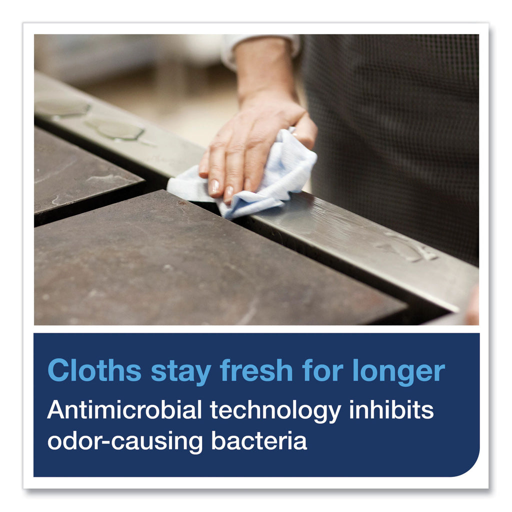 The Tork Foodservice Cleaning Towel is an excellent towel for use with quat sanitizers when the primary task is to deliver sanitizer to hard surfaces. Color-coded—designating area of use by color is a foodservice best practice that eliminates the potential for cross-contamination. Easy to rinse, dries quickly and is low linting. Good absorption will allow cloth to pick up dirt and mop up spills effectively. The product comes in a sturdy, easy to store self-dispensing corrugated box. Antimicrobial cloths inhibit growth of odor-causing microorganisms on the product surface.