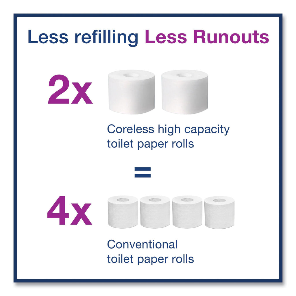 The Tork® Elevation® Coreless High Capacity Bath Tissue Dispenser is ideal for medium to high-traffic washrooms with high focus on guest satisfaction. Efficient dispenser ensures that toilet paper will always be available for guests by holding up to five times more paper than two conventional bath tissue rolls. Coreless rolls produce less trash to remove; Smart, stub-roll holder ensures full roll consumption to minimize waste. Compact horizontal dispenser saves space.