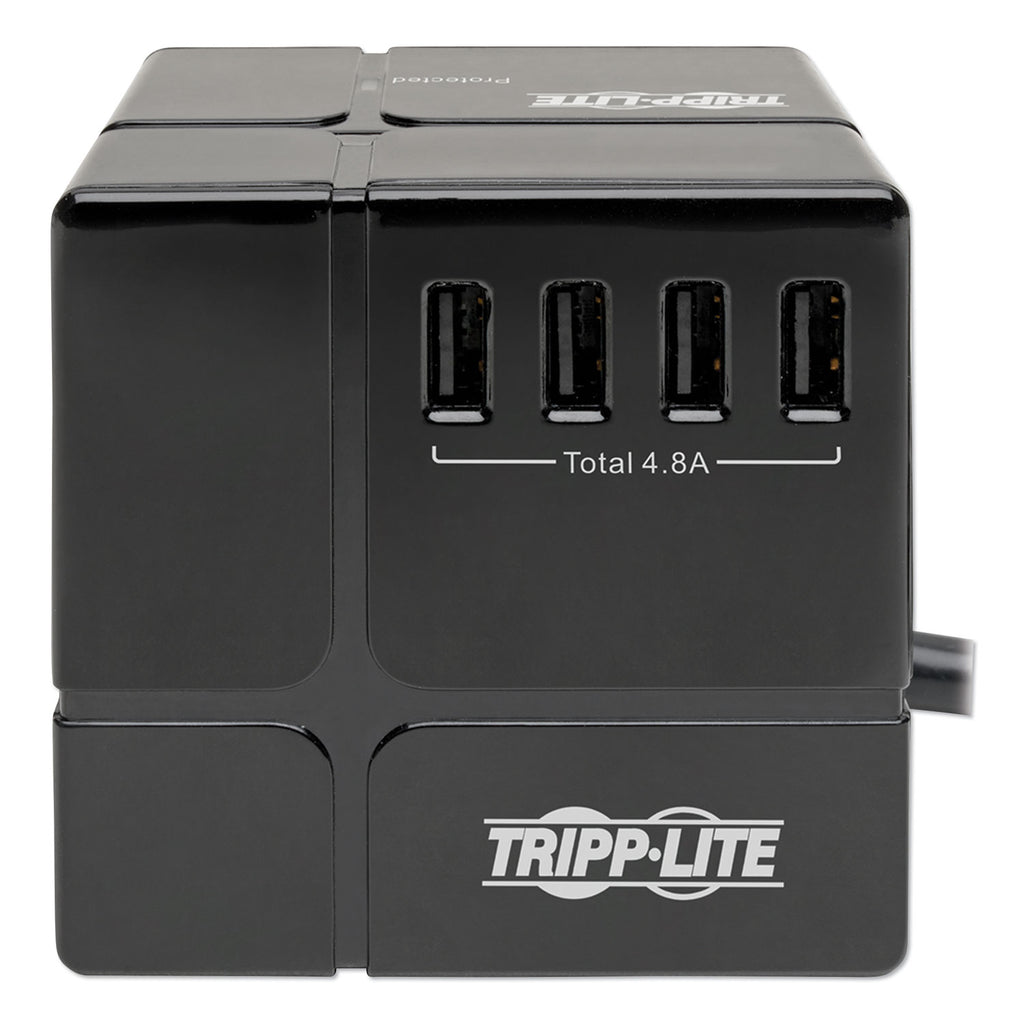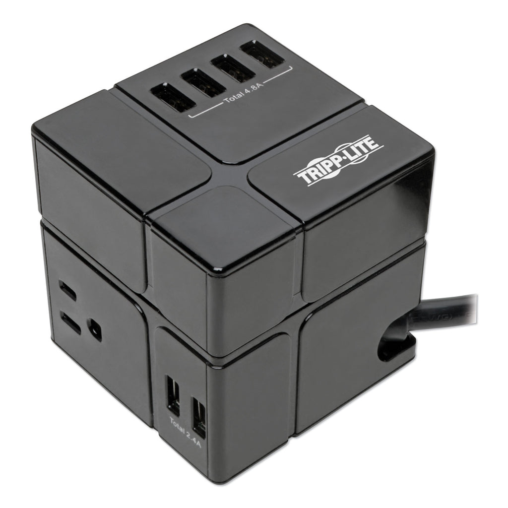 Ideal for your home or office workstation, this three-outlet power cube features a surge protection rating of 540 joules to defend your sensitive electronic components against strong power surges and spikes. Because residential power outlets have three wires—hot line (H), neutral (N) and ground (G)—the cube protects all three, covering the two protection modes: full normal mode (H-N) and common mode (N-G/H-G). Perfectly sized to fit inconspicuously into your workspace or take with you to the office, dorm, hotel or conference room. Three NEMA 5-15R outlets distribute AC power to connected home/office equipment. Six USB-A ports provide charging power for phones, tablets and other mobile devices. Six-foot pivoting cord with right-angle NEMA 5-15P plug allows flexibility in placing the cube. Green LED reassures you at a glance that your connected electronics are protected.
