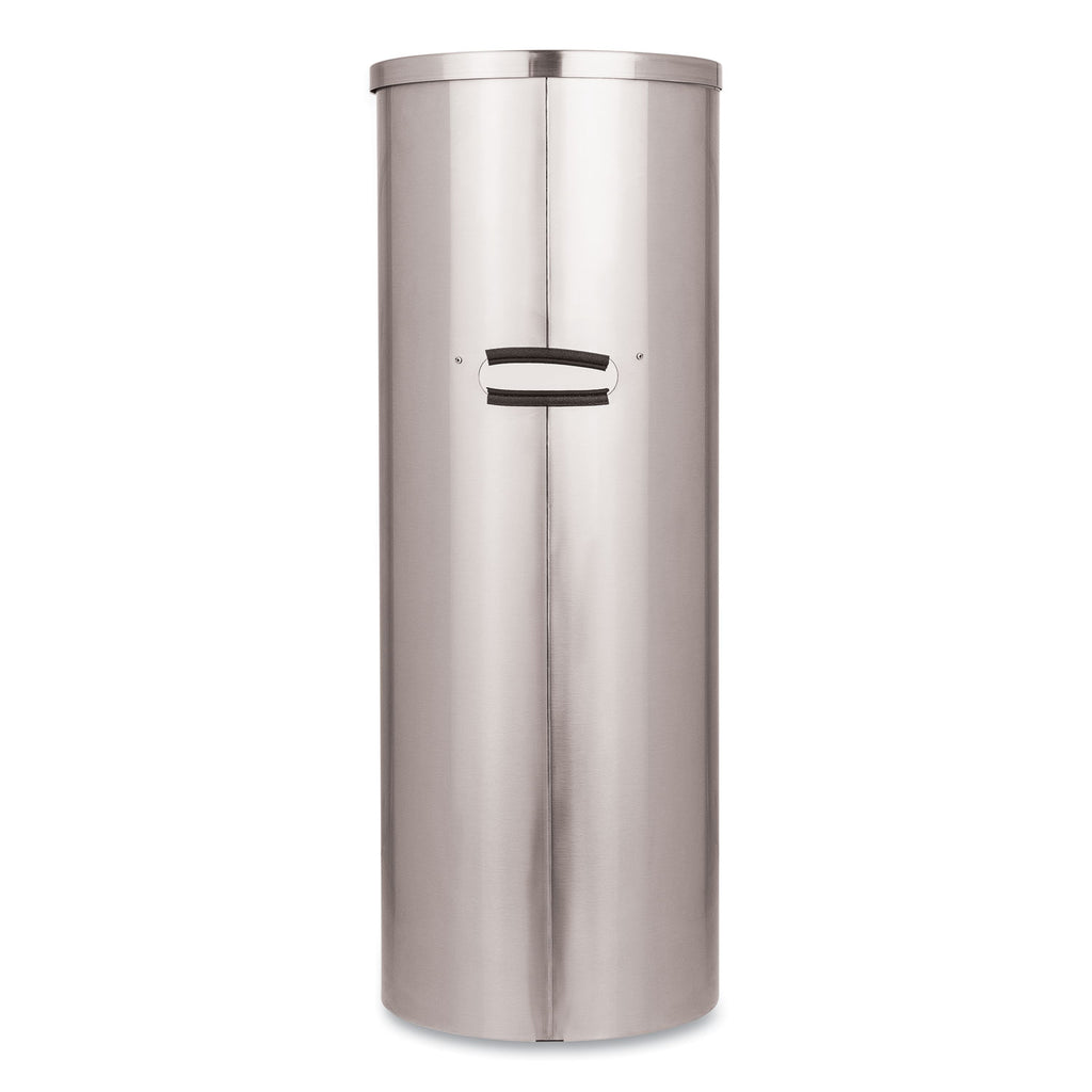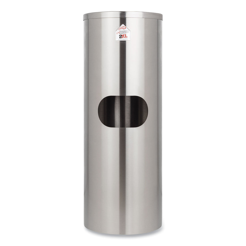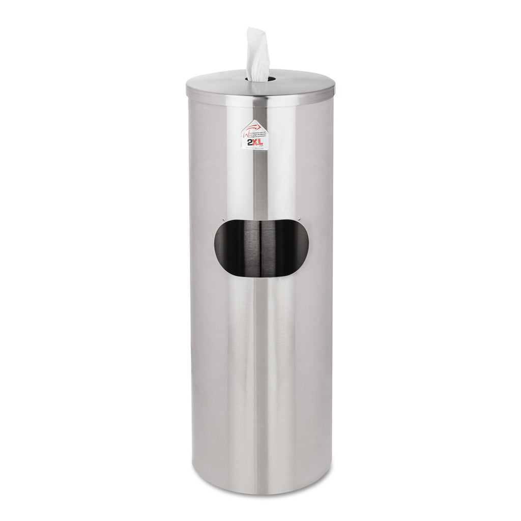 Duo dispenser and waste receptacle. Sleek and compact piece holds wipes and 5 gallon trash bin. Heavy-gauge steel unit perfect for high traffic areas.