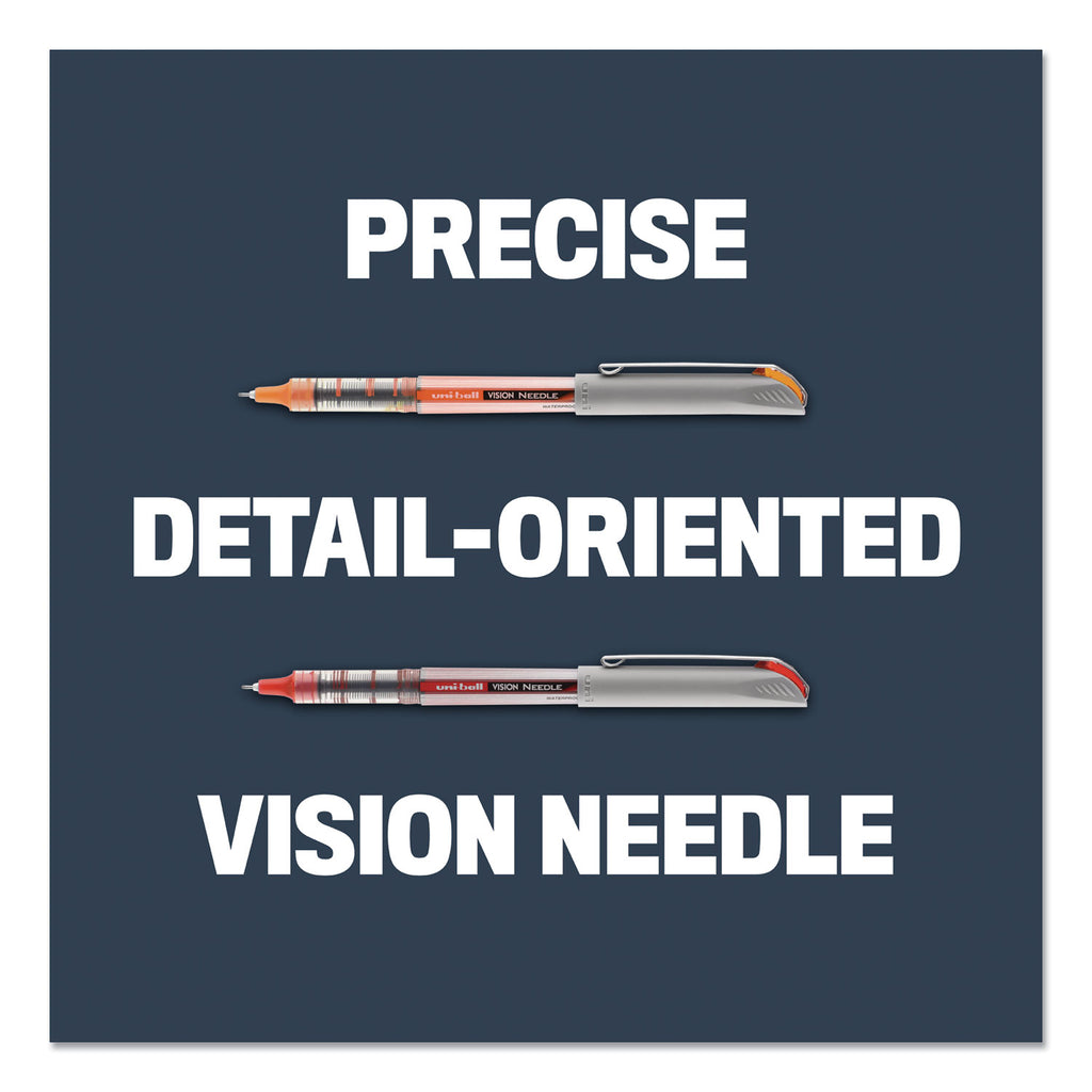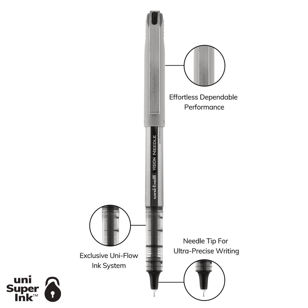 Stock your office, home or classroom with Vision Needle Stick Rollerball Pens from uni-ball featuring a strong, long lasting 0.7 mm fine point. These needle point pens are designed with a bend resistant tip for better accuracy. Even-flowing, pigment-based roller ink delivers a smooth writing experience for reliably smooth, vivid lines and a rich color for improved clarity and readability. Use these fine point rollerball pens to create perfect letters, numbers and graphics. Innovative uni Super Ink technology effectively entraps the liquid ink into the paper, producing fraud, fade and water-resistant documents that resist check washing or bleaching. The 0.7mm fine needle point allows you to create ultra-precise, straight edge lines with ease. The exclusive Uni-Flow Ink System ensures a consistent, delightfully fluid writing experience, and a translucent window ensures that you don't run out of ink unexpectedly. Enjoy beautiful clean lines and give all of your ideas a burst of brilliant color with this classic style fine point rollerball pen.